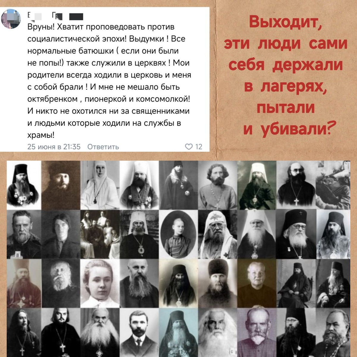 Под рассказами о новомучениках и исповедниках российских, которые в годы после революции подвергались пыткам и казням за веру в Бога, нередко можно встретить обвинения во лжи. Что, дескать, неправда это всё. Пречистый и непогрешимый СССР не только обеспечивал каждого гражданина разносолами, особняками, лучшим в мире образованием и путёвками на моря в несметном количестве, но и почитал духовенство и чуть ли не агитировал граждан ходить в храмы, всесторонне заботясь о духовном развитии каждого жителя Великой страны. А все эти истории про лагеря и казни за веру просто навыдумывали попы на "мерседесах" и другие вруны, продавшиеся врагам, чтобы покрыть позором Советский Союз. Те близкие, с которыми я смогла пообщаться, не застали раннего СССР. Но ощутили на себе отклики яростной борьбы с православием. Мою бабушку после 4-го класса исключили из школы за то, что директриса увидела её выходящей из храма. Маму в школе дразнили «боговерущей» просто за то, что она носила на груди крест. И повер