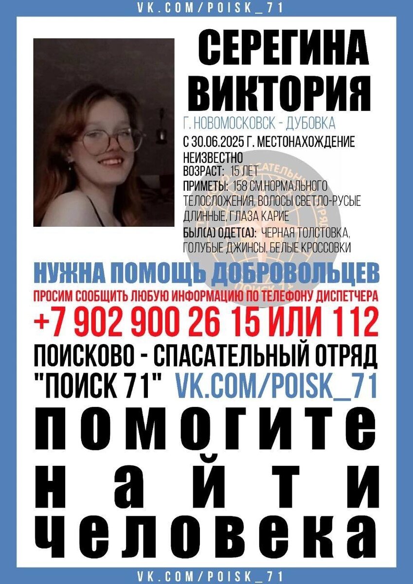 Внимание!!! Максимальный репост!!! Помогите найти подростка!!! Пропала : СЕРЕГИНА ВИКТОРИЯ, 15 лет Проживает: г.Новомосковск- Дубовка С 30.06.2025 г. местонахождение неизвестно. Приметы: рост 158 см, нормального телосложения, волосы светло-русые длинные, глаза карие. Одета: черная толстовка, голубые джинсы, белые кроссовки. Просьба всем, кому что-либо известно сообщить по телефону диспетчера 8 (902)900-26-15 или 112.