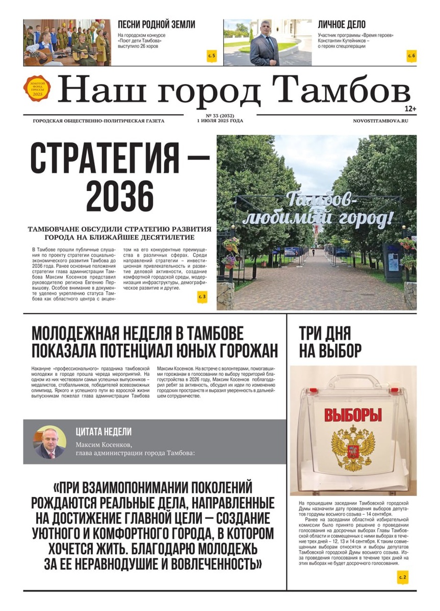Друзья, выходит новый номер нашей газеты. Читайте в выпуске: 📊Тамбовчане приняли участие в обсуждении стратегии развития города на ближайшее десятилетие ✅Выбирать депутатов гордумы будут три дня 🇷🇺Участник программы «Время героев» подполковник Константин Кутейников – об отношении к противнику, парадоксе мужества и героях спецоперации 👨✈️Журналист НГТ о том, кто приходит на службу в Госавтоинспекцию 📦В храме Луганска встретили очередную партию гуманитарной помощи из Тамбова ⚕Медали имени Фарбера удостоены 14 тамбовских медработников 🛠Благоустройство будущего парка «Ласки» ведется по графику 🎤На городском конкурсе «Поют дети Тамбова» выступило 26 хоров 📱Тамбовчанам доступны десятки публичных точек Wi-Fi 🌺Тамбовчан приглашают к участию в смотре-конкурсе «Тамбов в цвету» Эти и другие материалы вы найдете на страницах газеты «Наш город Тамбов». Ищите в киосках города, читайте на сайте novostitambova.ru и ТГ-канале - https://dzen.ru/id/5d7a3d1b32335400ab488ec6