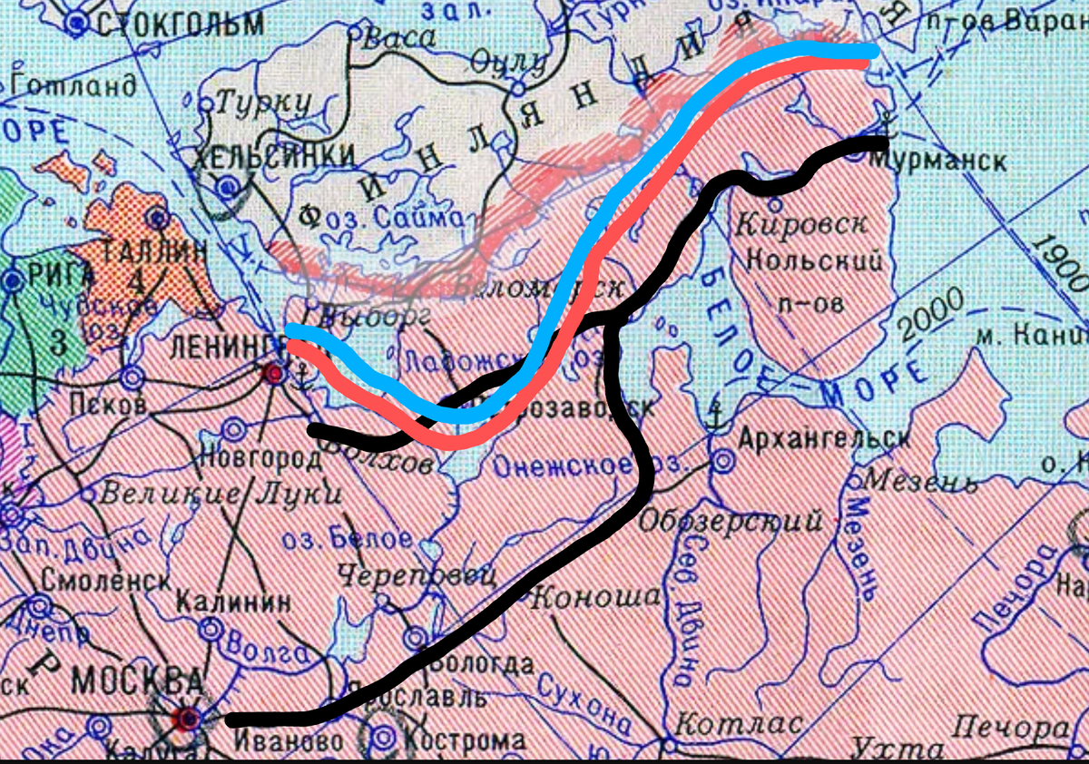 На схеме черным цветом указаны ж.дороги, красным и синим — линия фронта, максимальное продвижение финских войск. Ж.д. ветка на Ленинград была захвачена, но грузы из порта Мурманска шли восточнее по другой ветке через Вологду, Ярославль.