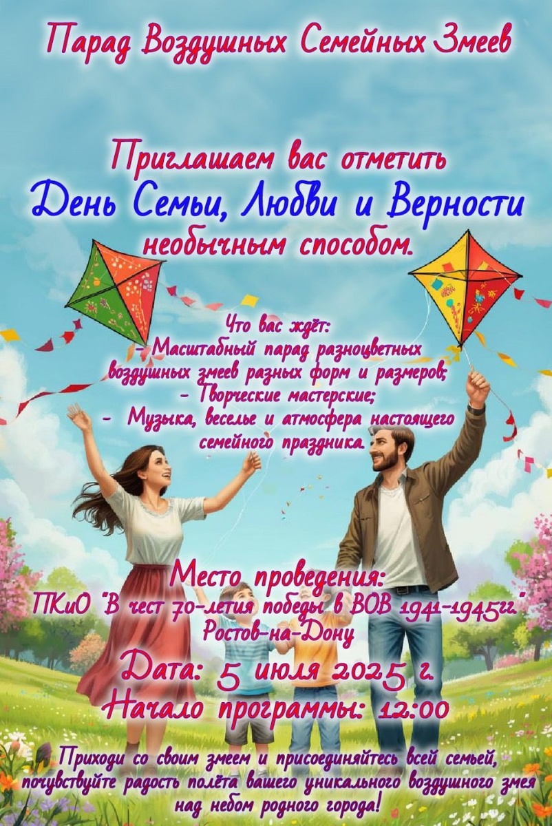 Парад Воздушных Семейных Змеев в День Семьи, Любви и Верности. Можно запустить своего воздушного змея в небо. (Если у вас ещё можно принять участие в мастер-классе по изготовлению и запуску семейного змея прямо на месте). Что вас ждёт: - Масштабный парад разноцветных воздушных змеев разных форм и размеров. - Творческие мастерские. - Музыка, веселье и атмосфера настоящего семейного праздника. ПКиО «"В честь 70-летия Победы в ВОВ", мкр. Суворовский, город Ростов-на-Дону 5 июля в 12:00 🫠 Детские мероприятия Ростов-на-Дону. Я местный!
