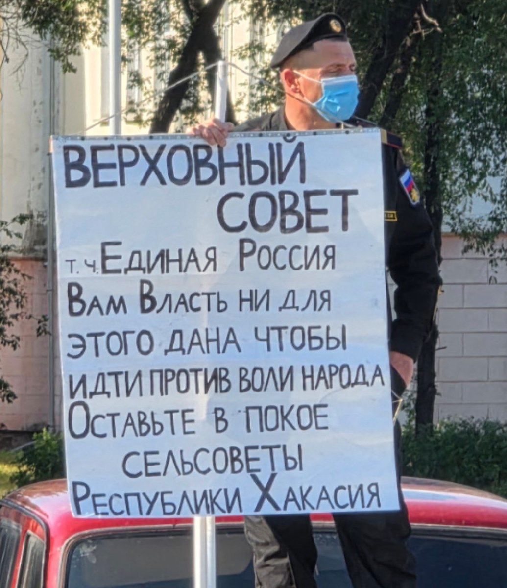 «Верховный Совет! В том числе „Единая Россия“, вам власть не для того дана, чтобы идти против воли народа. Оставьте в покое сельсоветы Республики Хакасия», — говорилось на плакате.