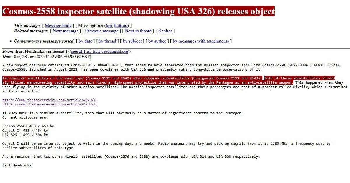 ❗️⚡️Российский спутник-"инспектор" "Космос 2558", преследующий американский спутник, вывел на орбиту неизвестный объект, утверждают в США.