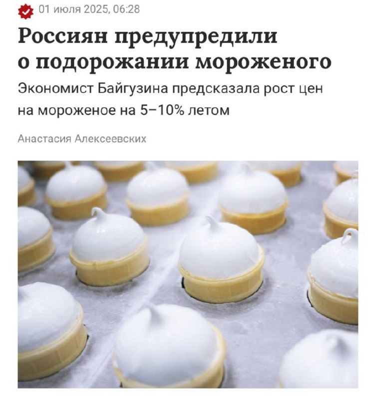 Мороженое подорожает на 5–10% уже этим летом из-за увеличения расходов на сырье, упаковку и логистику. Несмотря на то, что в последнее время инфляция стабилизировалась, производителям нужно учитывать её при формировании цен. Доцент кафедры экономики и управления ИМЭС Люза Байгузина считает, что сезон тоже внес свой вклад: Летом наблюдается традиционный пик потребления мороженого, что создает условия для повышения цен производителями и продавцам С таким холодным летом мороженое и не нужно