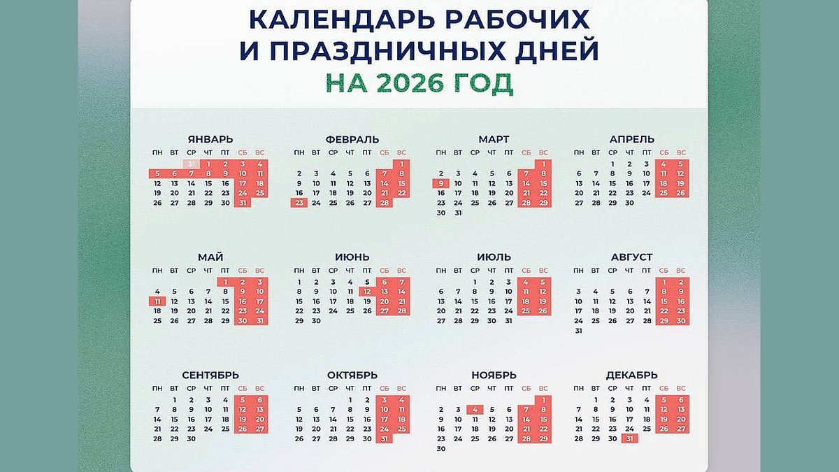 Министерство труда представило календарь праздничных и выходных дней на 2026 год. Проект постановления Правительства Российской Федерации опубликован на официальном портале regulation.gov.ru. В соответствии с законодательством, Правительство ежегодно принимает решение о переносе выходных дней, которые совпадают с праздничными. Цель таких изменений — обеспечить оптимальное распределение рабочего времени и отдыха, а также объединить праздничные и выходные дни. Благодаря этому новогодние каникулы в 2026 году продлятся 12 дней — с 31 декабря 2025 года по 11 января 2026 года. В течение будущего года будут три периода с выходными днями продолжительностью три дня: в феврале, марте, дважды в мае и на День России в июне. Если праздничный день совпадает с выходным, то выходной день переносится на следующий рабочий день в соответствии с нормами Трудового кодекса. В соответствии с проектом постановления, выходной день 3 января, который выпадает на субботу, предлагается перенести на 9 января, а вых