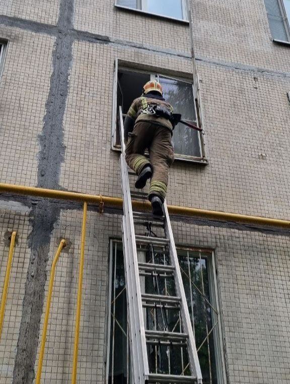 Женщина сообщила, что с третьего этажа её затапливает её же квартира, а замок на двери внезапно сломался. У нее две квартиры в доме на соседних этажах. По трехколенной лестнице спасатели вошли в окно 2 этажа, открыли неисправный замок. Потоп оказался подтекающей батареей.