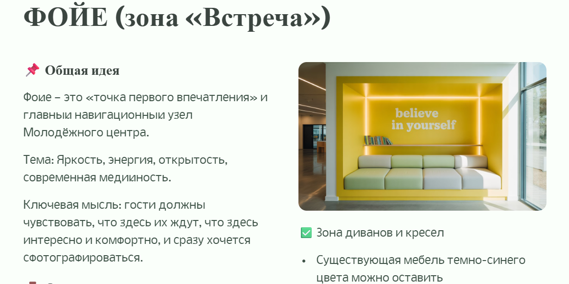 Когда ко мне обратился Молодёжный центр в Улан-Удэ с задачей обновить интерьер, я сразу поняла: это не просто ремонт. Это проект с характером, который обязан продавать. Да, именно продавать — через энергию пространства, через впечатление, через эмоцию. Потому что интерьер — это не стены. Это способ разговаривать с людьми, вдохновлять их, давать точку притяжения. Я отношусь к таким задачам как к сотворчеству. Я не просто рисую цвет и мебель — я помогаю клиенту показать миру своё лицо. И этот центр стал настоящим примером: как можно через дизайн создавать поток новых гостей и сохранять уважение к разным культурам и стилям жизни. Любой сильный проект начинается с анализа ЦА. В Молодёжном центре аудитория очень многослойная: Каждому из них важно своё: кому развивать ребёнка, кому найти единомышленников, кому снимать TikTok, кому делать мастер-классы. И моя работа — не навязать своё, а услышать, почувствовать, чем живёт каждая группа, и что для них значит «своё» пространство. Без этого ди