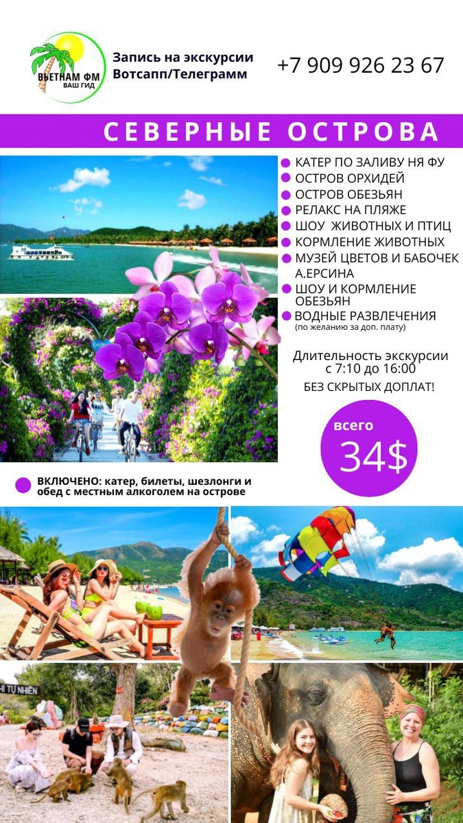 🌁 СЕВЕРНЫЕ ОСТРОВА ИЗ НЯЧАНГА 📆 4, 6, 8, 10 июля Залив Ня Фу+два острова🪷 🌴 пляж Орхидей, берюзовое море 🐘 слониха Лена, страусы, павлины, олени, попугайи и многие другие 🐒 пляж острова Обезьян, шоу с мартышками 🏄♀ водные развлечения И ещё много всего загадочного в сопровождении лучшего гида! ✅Все включено: 🔹трансфер 🔹 билет на катер 🔹 билет на острова 🔹 обед с ромом на острове орхидей 📆 4, 6, 8, 10 июля 🕒7:10-16:00 💎 30$ со скидкой 💌Для записи пишите @Alexey_Vietnam_FM