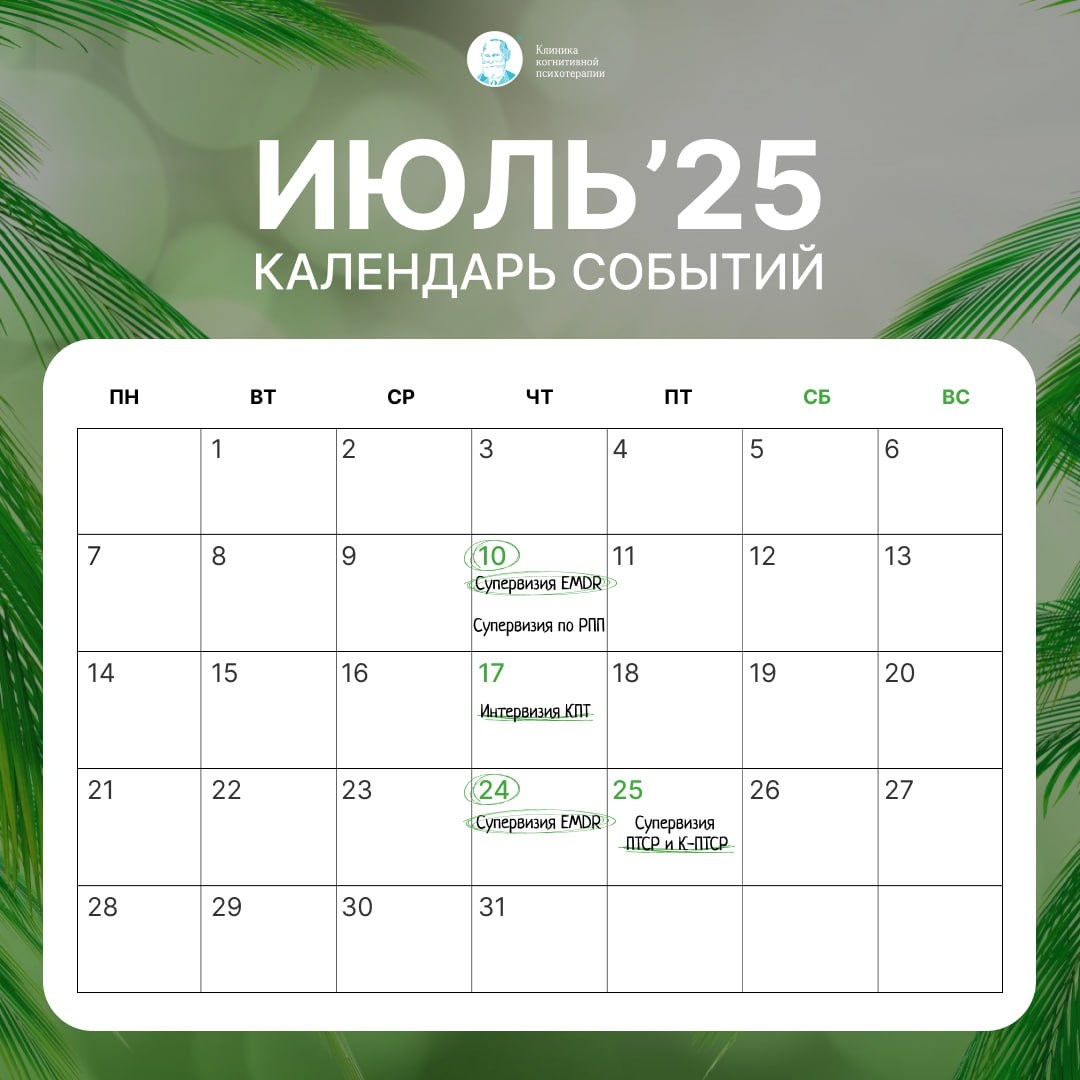 🌿 Афиша на Июль Коллеги, делимся анонсом образовательных программ CBT Clinic Education ⚡️ Напоминаем, что по окончании образовательных программ участники получат удостоверение о повышении квалификации установленного образца ❤️ NEW Введение в сексологию еще есть возможность присоединиться! Ведущий: Дмитрий Орлов 27 июня, 4, 11 июля 2025 Онлайн с 18:30 до 21:30 по МСК Регистрация: https://cbtclinic.education/sexology 👁 Базовый тренинг EMDR: 1 ступень Ведущий: Юлия Малик 18, 19, 20 августа 2025 Онлайн с 9:30 до 18:30 по МСК Регистрация https://cbtclinic.education/emdr (сертификат участника семинара) 🎓 Базовый тренинг КПТ Ведущий: Павлов Сергей старт 11 октября Онлайн с 10:00 до 17:00 по МСК Регистрация: https://cbtclinic.education/cbt_study 🍩 Психотерапия расстройств пищевого поведения, основанная на концептуализации Ведущие: Аверкова Дарья, Дашкова Евгения старт 2 октября Онлайн c 14:00 до 18:15 по МСК Регистрация: https://cbtclinic.education/edtherapyconcept 🔥 Курс «Те