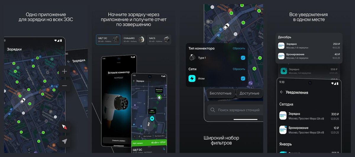 Карта зарядок, выбор и оплата сессии будет доступна так же прямо из самого Автомобиля - предустановленное приложение будет на всех Атомах, где далее через планшет возможно будет построить маршрут и оплатить зарядку сразу из авто, не доставая смартфон