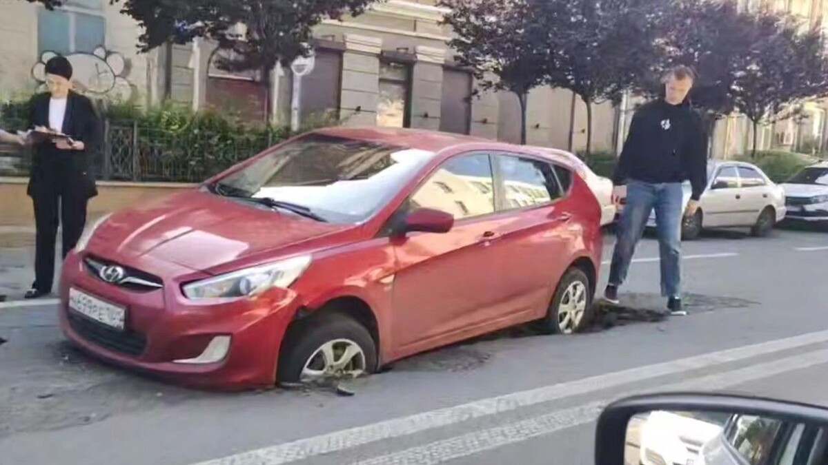 Застряла в текстурах: машина провалилась в асфальт у здания правительства в Ростове