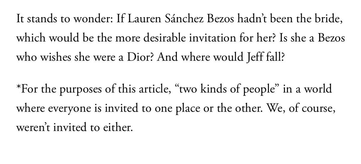 Какой удивительный токсичный бред несет колумнистка Vanity Fair. Это очень антитрамповское издание, поэтому МАГА-эстетика и гестлист громкой свадьбы Безоса бесят колумнистку отчаянно. И та вспоминает, что параллельно свадьбе в Париже прошел первый показ Джонатна Андерсона в Dior. Где люди не *** блюде, как у Безоса, а Рианна, Сабрина Карпентер, сам Роберт Паттинсон и Пьерпаоло Пиччоли. "Есть два типа людей и два типа ивента", - чертит жирную линию Vanity Fair. "Что же делать тем, кто получил приглашение на оба мероприятия одновременно? Выбирать между крутостью и расчетливостью (between cool and calculating). Догадайтесь, где что", - подытоживает колумнистка, как будто кто-то не догадывается. Пфф, да естественно личный ивент, особенно свадьба, всегда интереснее, душевнее и важнее любого показа даже с самим Паттинсоном)) В конце и вовсе уже маразм попер: "А если бы Лорен НЕ БЫЛА НЕВЕСТОЙ - какой бы ивент она выбрала? А???" Если бы можно было придумать для этих критиков свою ФБ-групп