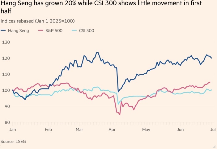 В первые шесть месяцев 2025 года акции материковых компаний не изменились в цене, в то время как индекс Hang Seng вырос на 20 %