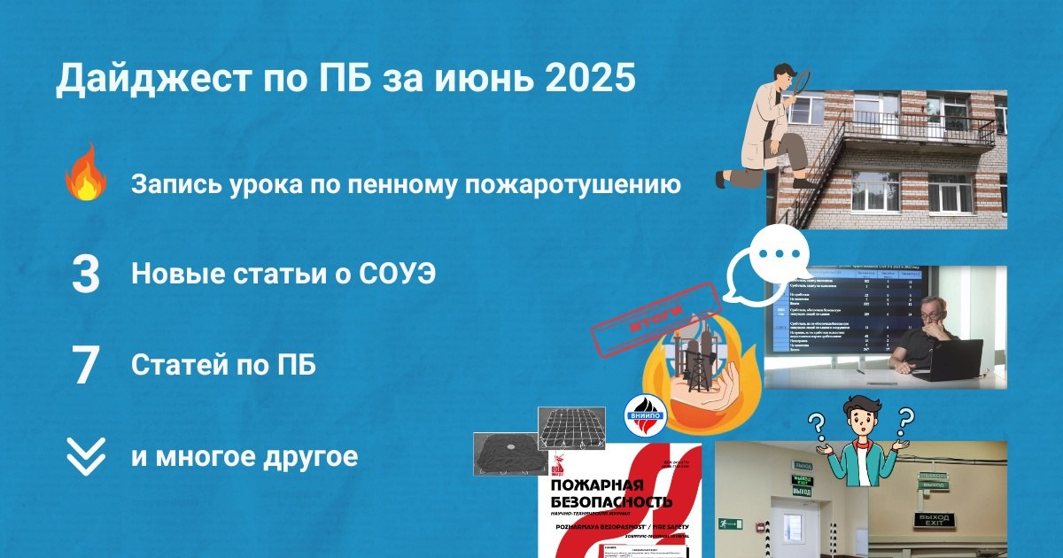 🔥 Подборка материалов за июнь 2025 Собрали для вас дайджест самых интересных публикаций по пожарной безопасности за июнь 2025 (https://clck.ru/3MsaaL) ❗Вы могли пропустить: → Обзор изменений №1 СП 486.1311500.2020 Перечень зданий и помещений, подлежащих защите АУП и СПС (https://clck.ru/3Msakn) → Когда суд защищает лицензию МЧС от аннулирования (https://clck.ru/3MsapB) → Дублирование световых оповещателей и световых указателей. Требование норм и перерасход бюджетных средств (https://clck.ru/3MsarM) → и многие другие новости (https://clck.ru/3MsaaL) 💬 Пересылайте дайджест коллегам, чтобы больше специалистов смогли ознакомиться с новостями отрасли!