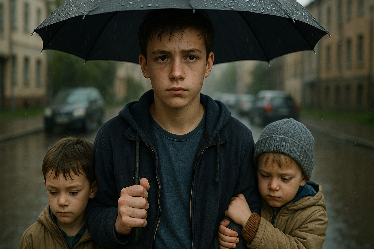 На улице моросил мелкий дождь — не тот, от которого спасает зонт, а тот, что проникает под воротник, крадётся по шее и делает утро ещё серее. Димка крепче сжал ладошку Мишки, которая была тёплой и немного липкой от варенья. Другой рукой он держал зонт, наклоняя его так, чтобы капли не попадали на Лёшку. Сам промокал, но молчал. Он был уже привычен к такому — себя на последнее место, братьев вперёд.