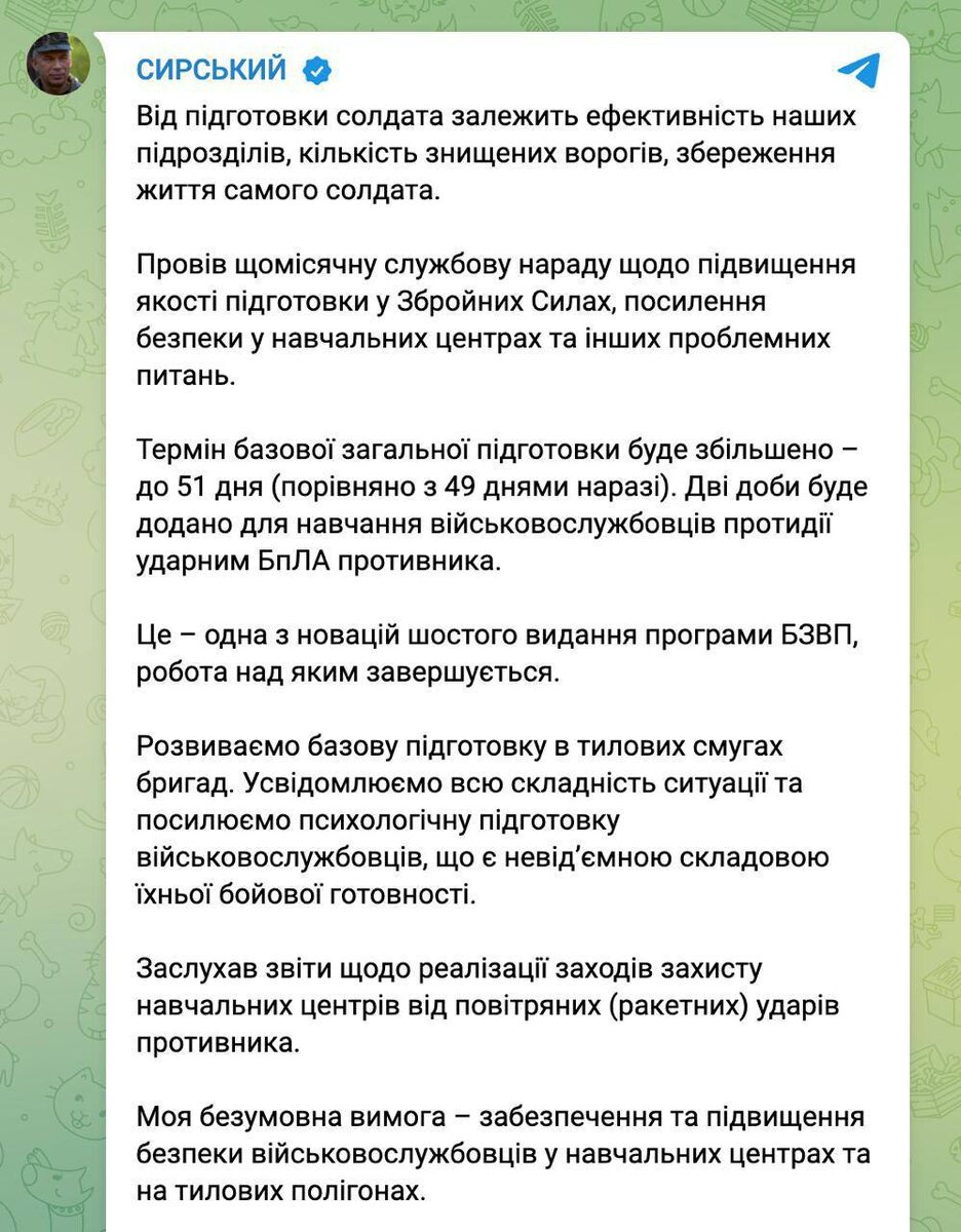 Срок базовой общей подготовки мобилизованных будет увеличен на целых два дня — с 49 до 51 дня, — главком ВСУ Сырский