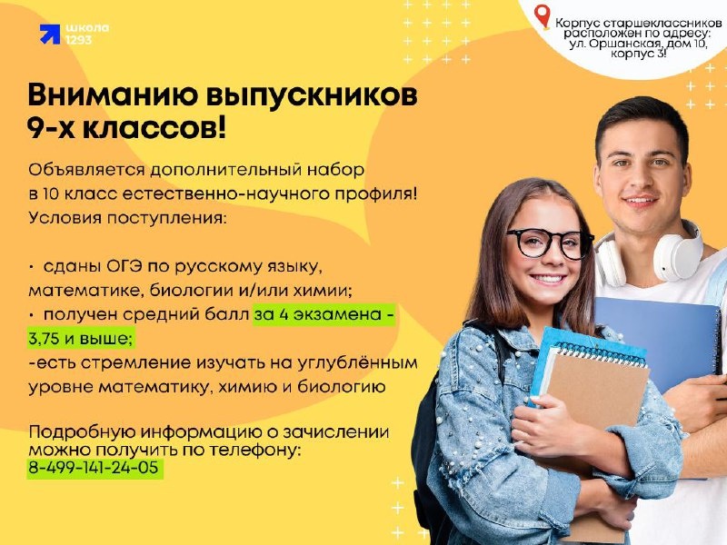 🌟Объявляется дополнительный набор в 10 класс естественно-научного профиля! Условия поступления: • сданы ОГЭ по русскому языку, математике, биологии и/или химии; • получен средний балл за 4 экзамена - 3,75 и выше; -есть стремление изучать на углублённым уровне математику, химию и биологию 📞Подробную информацию о зачислении можно получить по телефону: 8-499-141-24-05 #ДОНМ | #Предпрофкласс | #Школа1293 | #ЗАО | #ШколаКунцево | #РайонКунцево