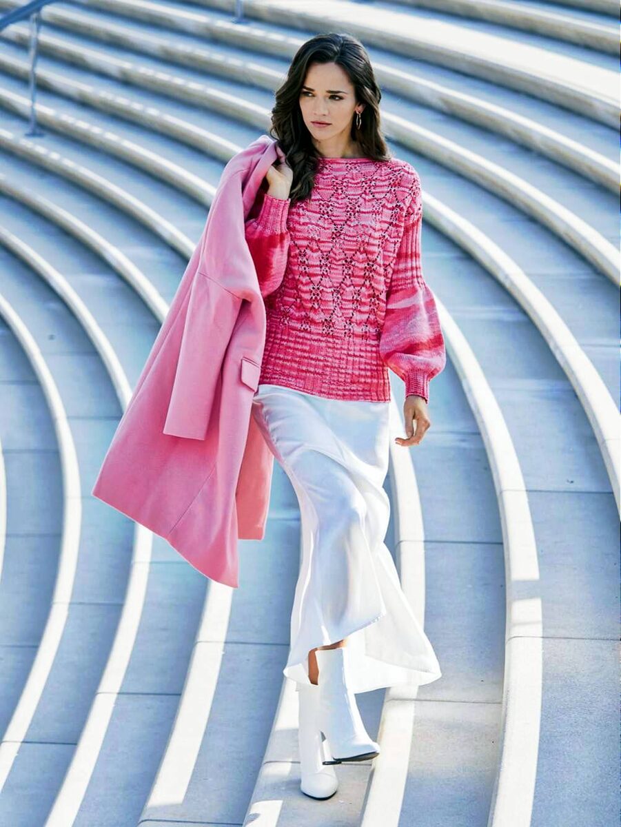 Для вязания нам потребуется 550 (600) 650 г розовой меланжевой пряжи WOLL-BUTT "Farah": 80% хлопок, 20% лён; 117 м/50 г.