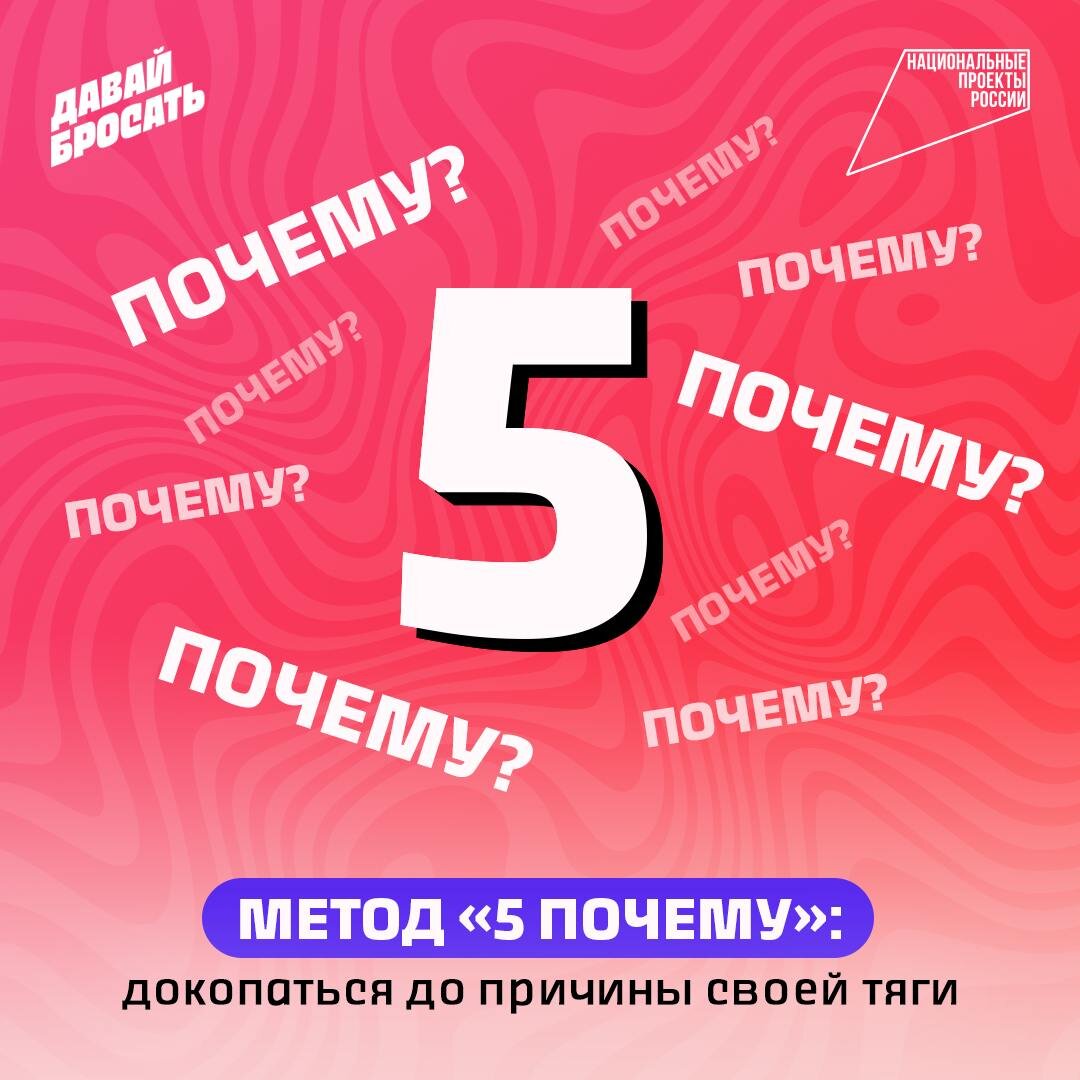 🎯 Вопрос на миллион: Почему ты хочешь курить прямо сейчас? Кажется, что ответ очевиден: «Потому что привык» или «Просто потянуло». Но если копнуть глубже, окажется, что за тягой скрываются стресс, скука или страх. Как это выяснить? Попробуй метод «5 почему» — технику, которую используют даже в бизнесе для поиска корня проблем. 🔜 Инструкция: Спроси себя: «Почему я хочу закурить?» → «Потому что нервничаю» Задай вопрос снова: «Почему я нервничаю?» → «Потому что начальник накричал» Продолжай: «Почему его крик меня задел?» → «Потому что я не успел сделать отчёт» И ещё раз: «Почему не успел?» → «Потому что отвлёкся на соцсети» Финальный вопрос: «Почему я зависаю в соцсетях?» → «Потому что не знаю, с чего начать работу» Итог: Тяга к сигарете из-за прокрастинации! Теперь можно попробовать решить конкретную проблему (разбить задачу на шаги), а не курить. 📌 Задание: В следующий раз, когда потянет курить, запиши свою цепочку «5 почему» и делись в комментариях — поможешь другим! #зак
