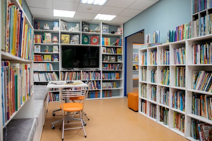 Библиотека разделена на два основных зала: для малышей до 12 лет и для подростков 12-17 лет. В старшем зале создано особое пространство для общения и совместной работы: стол, будто спрятанный за стеллажами. Здесь ребята встречаются, обсуждают книги, делятся впечатлениями.