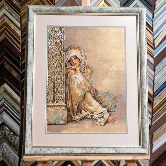 Наша постоянная заказчица Нина из Москвы вышила арабскую девочку. Оформили мы работу в двойное паспарту. Кантик фисташкового цвета, а багет как будто сделан из камня. Получилось, как мне кажется, очень здорово! 😍