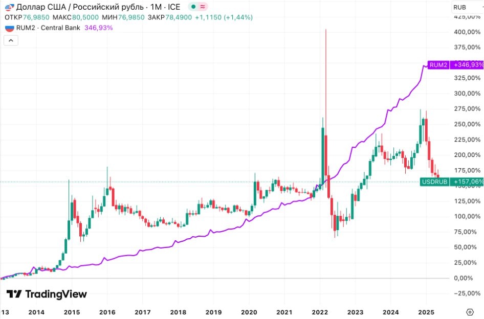 Почему доллар — это лучшая идея сегодня? Обращу ваше внимание на аномалию в рубле. Почему-то доллар по 80 никому не интересен, а по 100 будет паника и вопросы — как на этом заработать? 👉Денежная масса (М2) С 1 февраля 2022 рост ден. массы в РФ — +76%. В США за тот же период — +1,5%. Курс USD/RUB за это время — +1,3% (с 77,47 до 78,46). До СВО была прямая зависимость: растёт М2 — ослабевает рубль. Сейчас — сильное отклонение от тренда, как в июне 2022 (курс 55). Курс рубля не отражает рост денежной массы. Дополнительное снижение ставки ускорит рост М2. 👉Ключевая ставка ЦБ РФ и ФРС Мыслительный эксперимент: в феврале 2022 открываю вклад в США и РФ на одинаковую сумму ($100 / 7800₽), под ключевые ставки. На июнь 2025: • США: $115 (+15%) • РФ: 12 472₽ (+60%) Бабушка в Сбере заработала в 4 раза больше долларов, чем американец. Классический кэрри трейд. Аномалия. 👉Бюджет Минфин заложил на 2025 курс 96,5. Факт — 78. Бюджет теряет 130–160 млрд ₽ в месяц. В мае 2025 Госдума утвердила