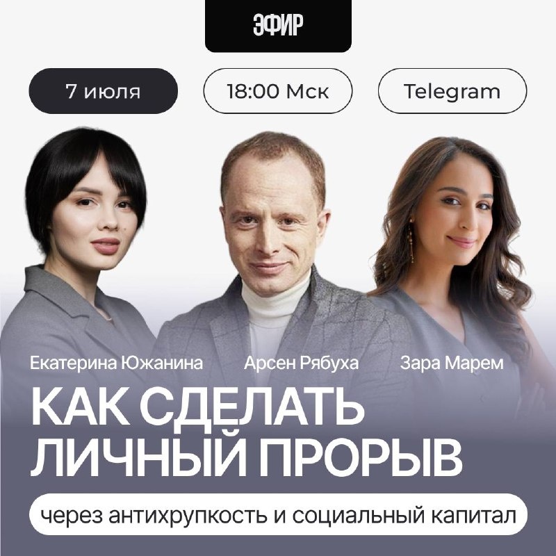 Друзья, ничего не планируйте на вечер 7 июля. Это нельзя пропустить! Проведем эфир на тему: Как сделать личный прорыв через антихрупкость и социальный капитал. СПИКЕРЫ Арсен Рябуха Эксперт в области change management, коуч, психолог Более 20 лет тренирует команды. Проводит легендарную программу по достижению целей “Контекст”. Один из самых востребованных и эффективных тренеров в России. Соавтор книги “Контекст жизни. Как управлять привычками, которые управляют нами” Зара Марем Идейный вдохновитель Caspian Business Camp. Основатель travel-сообщества предпринимателей и управленцев «Бизнес Перевал» О ЧЕМ ПОГОВОРИМ: 👉Секрет личного прорыва: Что на самом деле влияет на успешность 👉Как выстоять, когда все вокруг рушится 👉Как использовать кризис для своего роста 👉Как с 0 создать сильное окружение 👉Как использовать социальный капитал для своего развития Встретимся в этом канале @Личный бренд | Екатерина Южанина 7 июля в 18:00. Записи в открытом доступе не будет, поэтому поставьте в
