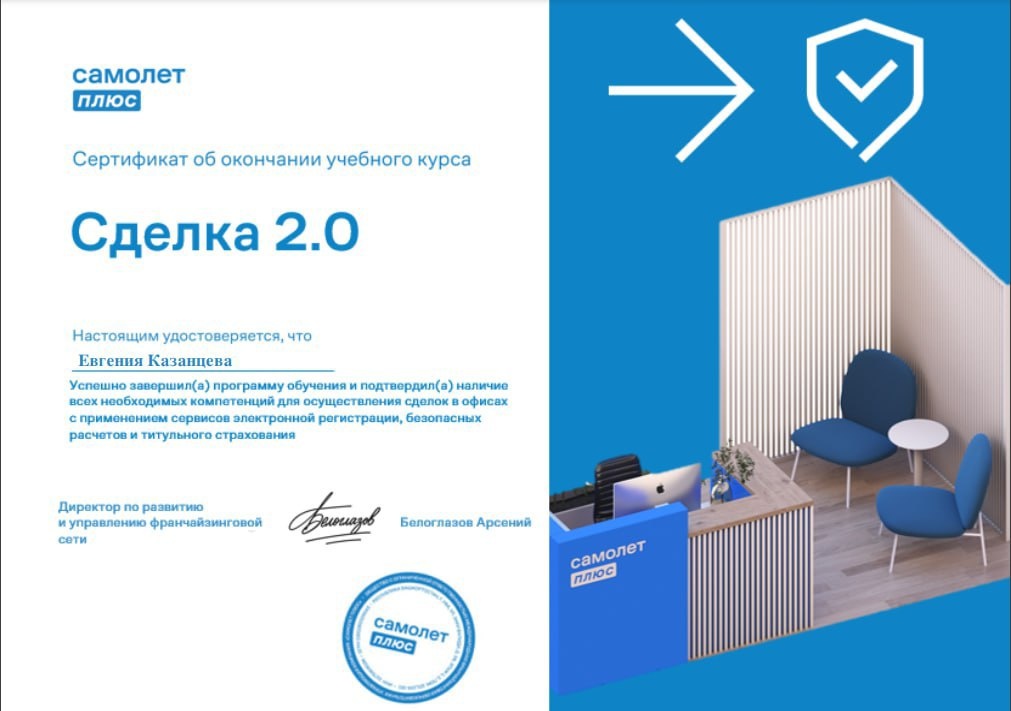 ✅Прошла обучение по курсу «Сделка 2.0» от «Самолёт Плюс» — и теперь ещё больше уверенности в каждой сделке, в каждом шаге и в каждой рекомендации.
