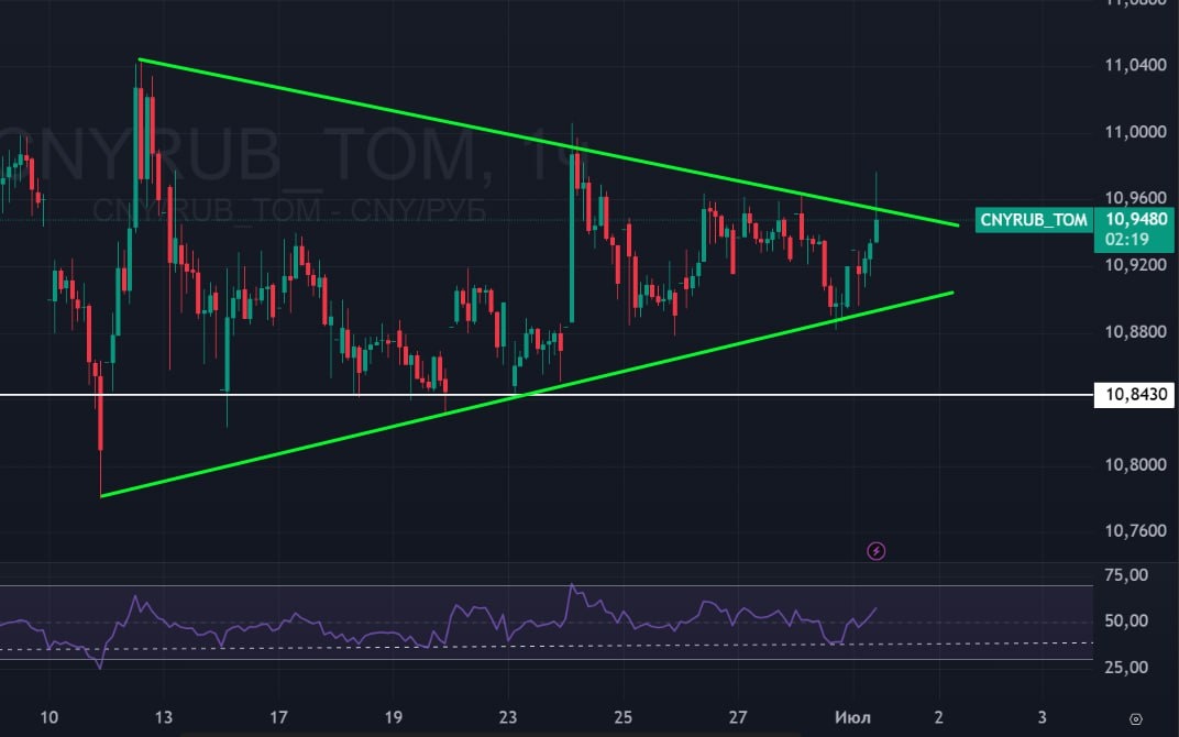 🟢 Кстати, треугольник в юане все еще существует, так как мы получили реакцию от его нижней границы. Импульсный выход из треугольника даст нам понимание, что эта фигура существует, тогда будут понятны цели выхода из этого треугольника.