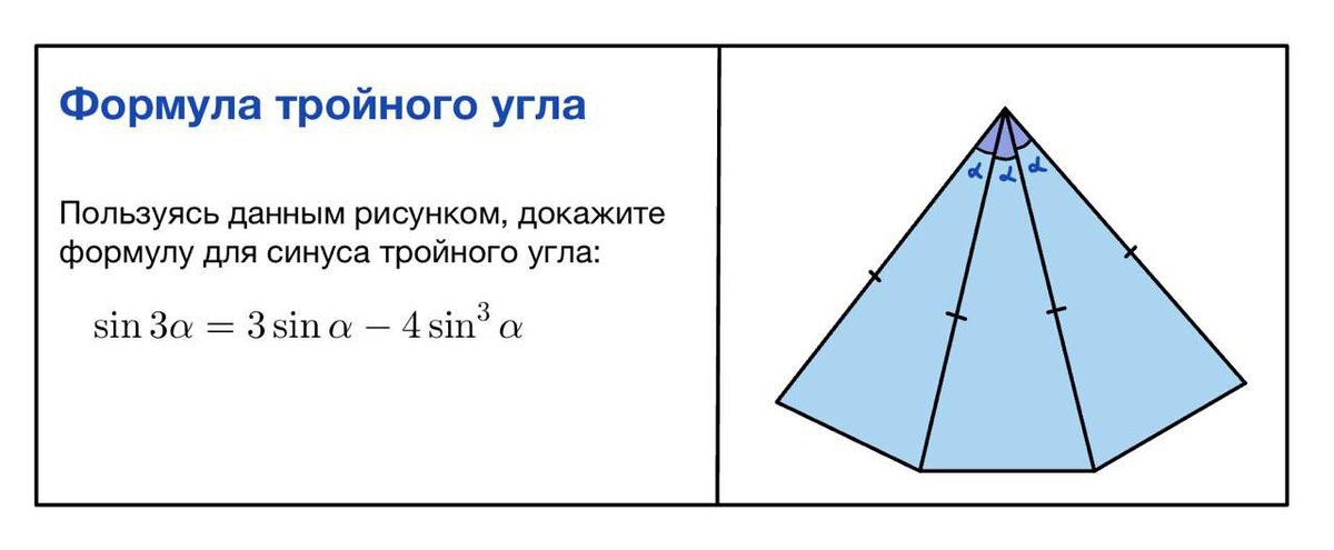 Массовая школьная математика давно стала гуманитарным предметом. Стандартные приёмы, задачи, правила и алгоритмы. Заучивай на карточках, как правила русского или английского языка. Думать даже не всегда нужно - просто применяй типовые алгоритмы. Иногда полезно и интересно не заучивать, а понимать и выводить. Например, сегодня рассмотрим одно из доказательств формулы тройного угла через геометрию (sin3a=3sina-4sin^3a). По формулировке на рисунке сразу напрашивается идея с окружностью и углами. Тут нарисована часть правильного многоугольника. Одно из изящных решений через площади. Площадь каждого из трёх равнобедренных (радиусы равны 1) треугольников равны половине синуса угла (по формуле площади треугольника через половину произведения сторон на синус угла между ними). Площадь из трёх треугольников можно также рассчитать как сумму площади одного большого треугольника (рисунок справа выше) и равнобедренной трапеции. Чтобы найти площадь трапеции мы выражаем сторону многоугольника x по тео