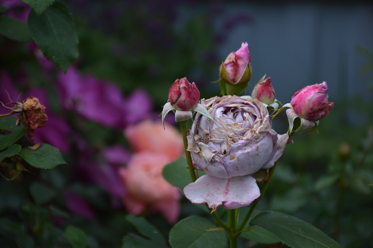 А ведь как хорошо всё начиналось! Сколько было бутонов! Я такого ждала цветения....Оно и началось, пока было солнечно и сухо. А теперь что? Бутоны не раскрываются и гниют, превращаясь в нечто омерзительное. Вот роза 'Айсфогель', что в переводе с немецкого означает "зимородок". Её цветение пропало полностью. Ни одного цветка. А ведь это изумительно красивая роза: наружные лепестки холодно-розового тона, внутренние - розового, но тёплого. А аромат какой!