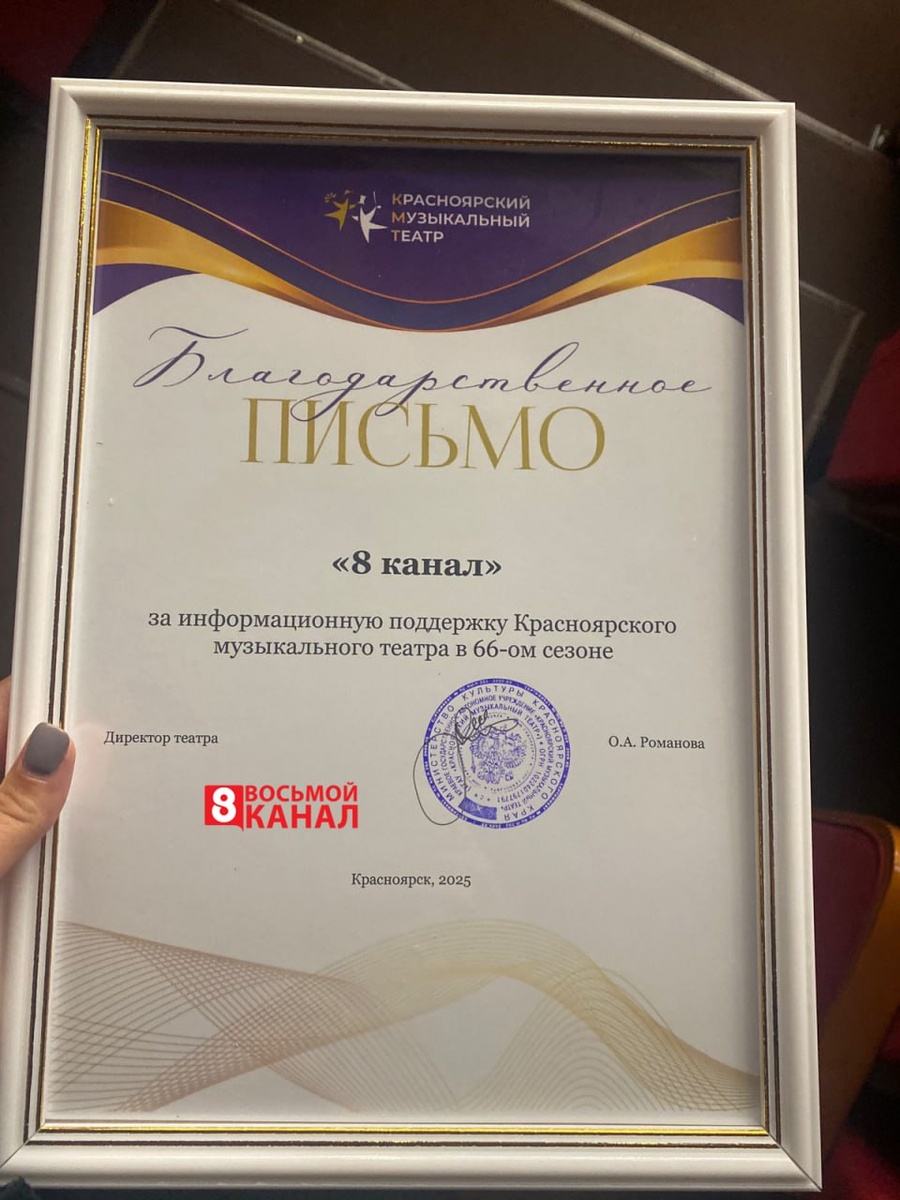 Также "8 каналу" торжественно вручили благодарственное письмо за информационную поддержку Красноярского музыкального театра.