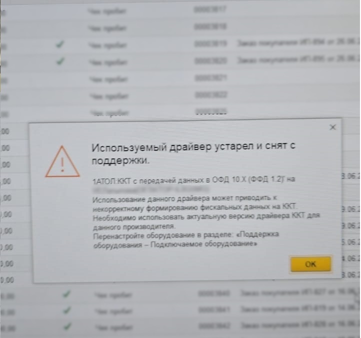 Все чаще клиенты обращаются с "ошибкой" при открытии/закрытии смены с формулировкой: "Используемый драйвер устарел и снят с поддержки" — скрин ниже. К сожалению, нет волшебной таблетки, так как всё зависит от конфигурации, прошивки на кассовом оборудовании и версии драйвера. Попробую описать несколько проблем, с которыми сталкивался — вдруг кому-то будет полезно. Во-первых, нужно пройти по пути, который указан в предупреждении: Администрирование (Настройки) → Поддержка оборудования → Подключаемое оборудование Там вы увидите вашу текущую настройку и драйвер. Я рассматриваю только на примере АТОЛ. Был драйвер: АТОЛ:ККТ с передачей данных в ОФД 10.Х (ФФД 1.2) Новый драйвер называется так: АТОЛ:ККТ с передачей данных в ОФД 10.x (ФФД 1.2) УСН НДС К сожалению поменять каким то легким путем нельзя либо мне не известен этот метод поэтому нужно создать новое подключение оборудования, перед этим открыв текущую настройку и запомнить какая организация и склад у Вас там выбраны После этого нужно сд