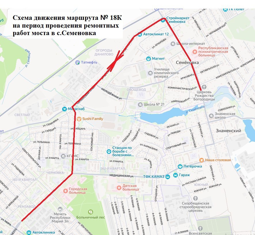 🚌Маршрут №18 К будет следовать по схеме движения: ул. К. Либкнехта, Сернурский тракт, д. Данилово (ул. Данилово), с. Семеновка (ул. Советская, до церкви), обратно - аналогично. В поселок Знаменский маршрутки заезжать не будут.