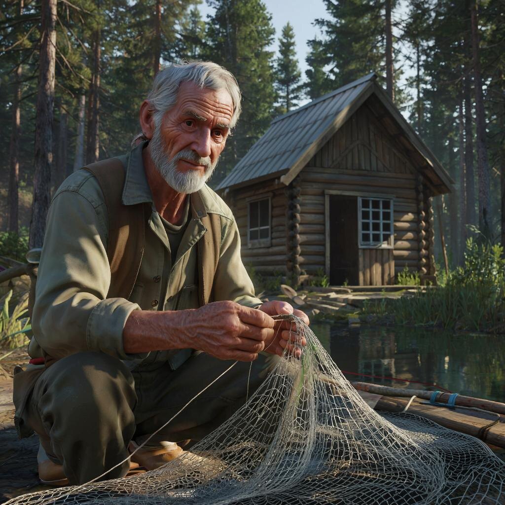 Когда я подошла, он сидел на крыльце, чинил старую сеть. Его лицо, обветренное и загорелое, было испещрено морщинами. Густые брови нависали над пронзительными серыми глазами, в которых, казалось, отражалась сама душа леса. Он был жилистый, крепкий, несмотря на свой возраст. Одет в грубую домотканую рубаху и штаны, заправленные в высокие сапоги. От него пахло дымом костра и терпкими травами.