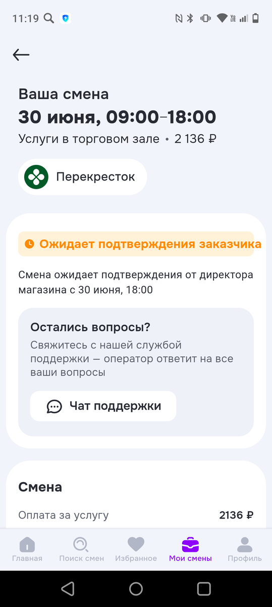 Продолжаю. Я работаю, хотя не знаю, отменена моя смена или нет? Тот это адрес или нет? Потом в час дня, когда я пошла на обед, интернет дали. Смену поставили, как текущую. Немного успокоилась. Доработала до конца.