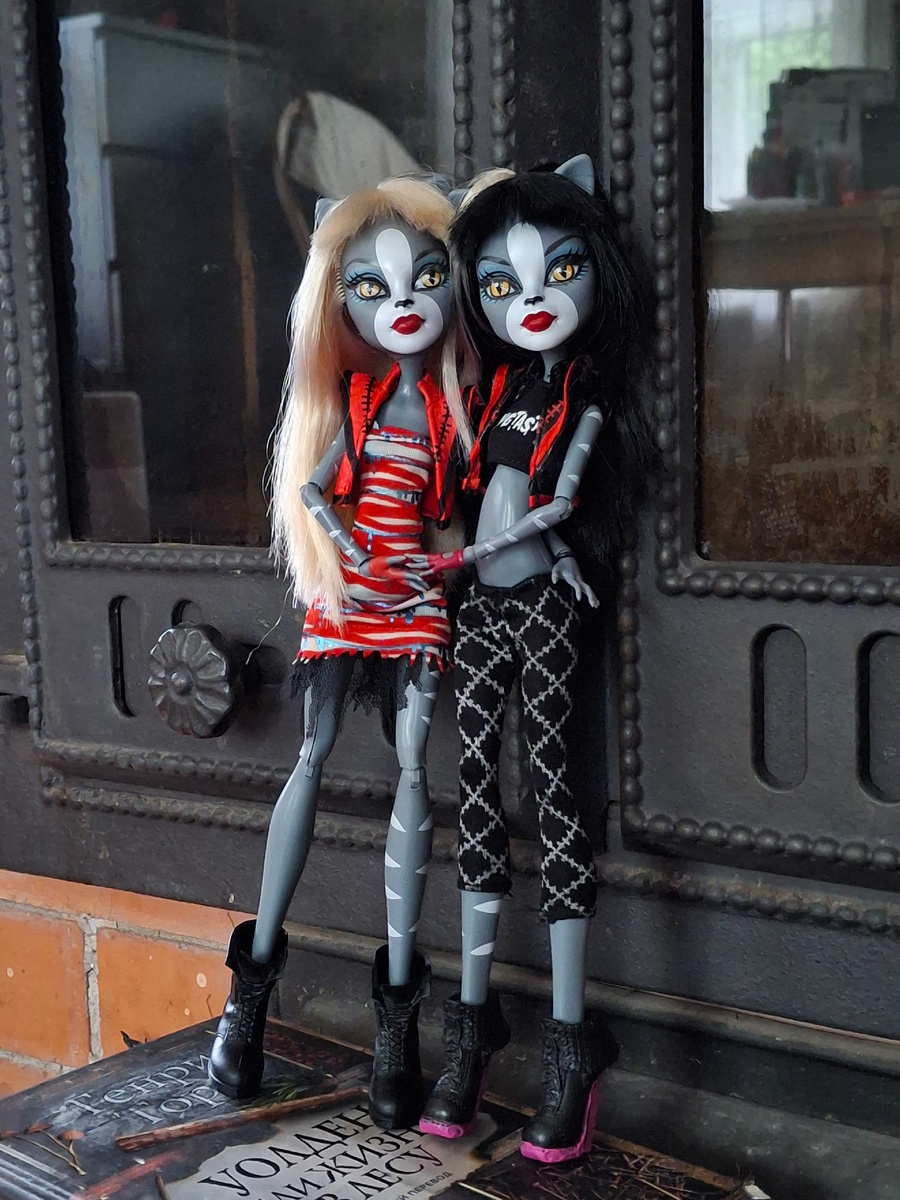 Мы с дочкой и кукложителями находимся на даче, одежду для всех взяли соответствующую. А поучаствовать в челлендже очень хотелось! Челлендж проходит тут, если вдруг кто-то не участвует, присоединяйтесь! Это весело)) Помочь с готическим стилем нам вызвались дочкины веркошки - Пурсефона и Миулодия из семейства Монстр Хай. Самое готичное у нас на этом этапе челленджа - сами кошки-оборотни)) Поскольку готичнее оборотней могут быть только вампиры)) Представим, что за их плечами - заброшенный замок, вход в который закрывают кованные ворота... - Мы милые, очень милые кошки.... - Хочешь узнать тайны этого замка? Подходи... подходи ближе, незнакомец... Мы покажем тебе... - Ну что же ты? - Ох, великая Бастет! Сестра! Ты опять всех распугала!