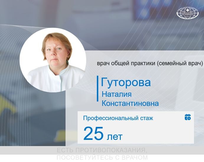 В клинике АО «Медицина» (клиника академика Ройтберга) принимает Гуторова Наталия Константиновна – опытный врач общей практики с 25-летним стажем. Высококвалифицированный специалист оказывает комплексную медицинскую помощь взрослым и детям, сочетая современные методы диагностики с индивидуальным подходом к каждому пациенту. 🎓 Образование – 1995 г. — Московский медицинский университет им. Н.А. Семашко, специальность «Лечебное дело» – 1995–1997 гг. — Клиническая ординатура по терапии на базе ММА им. И.М. Сеченова 📌 Квалификация – Врач общей практики (семейный врач) – Сертифицированный специалист по терапии, УЗИ-диагностике и клинической фармакологии – Опыт работы в ведущих медицинских учреждениях Москвы 💡 Профессиональные навыки – Диагностика и лечение широкого спектра заболеваний у взрослых и детей – Ведение пациентов с хроническими патологиями и профилактика осложнений – Ультразвуковая диагностика (УЗИ) – Индивидуальный подбор терапии с учетом особенностей пациента 🔍 Опыт работы – В