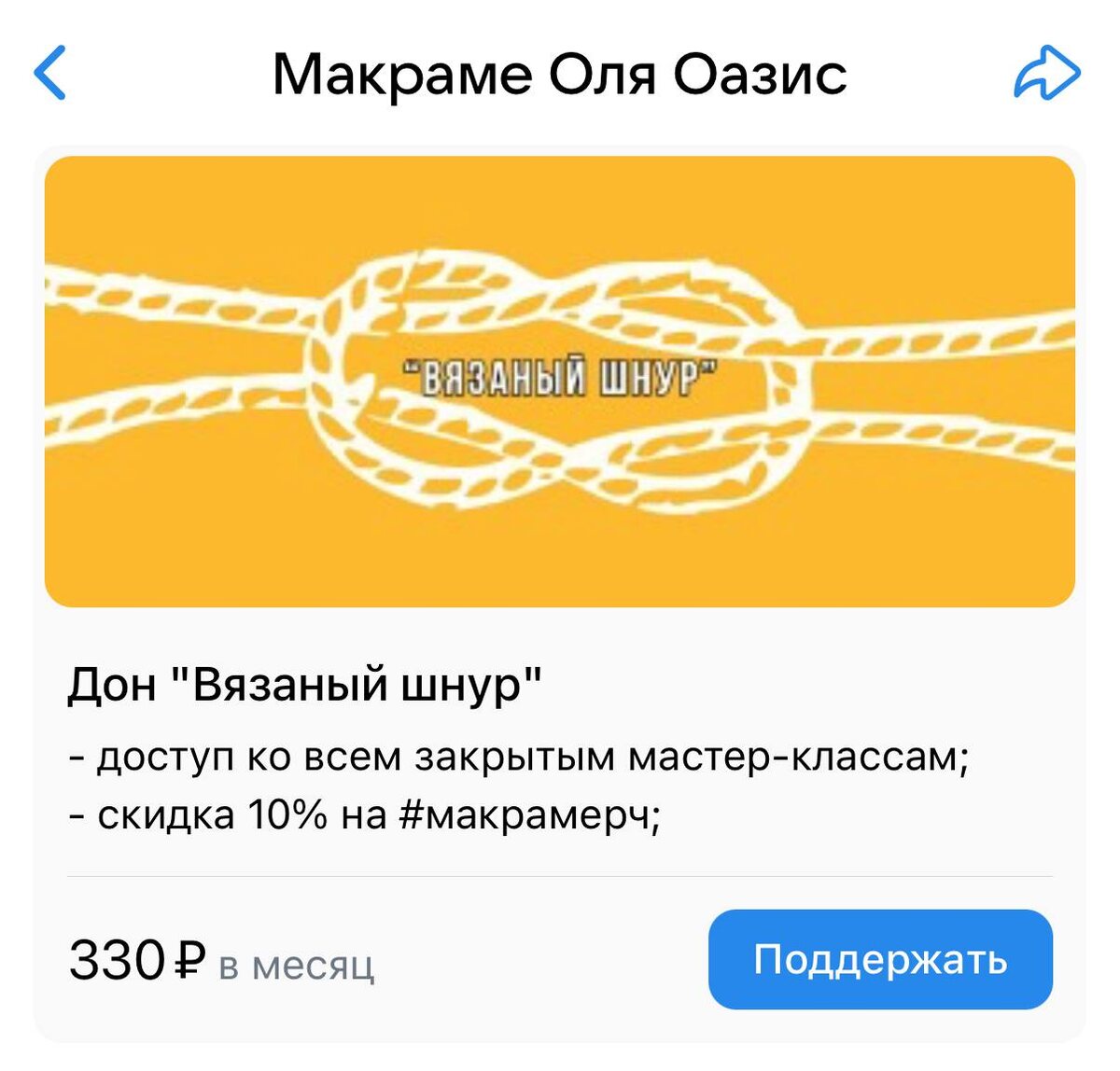 В ВК сообществе создала три типа регулярной поддержки моего творчества: - Дон «вязаный шнур» - Дон «хлопковый шпагат» - Дон «крученая веревка» Отличия прописала и самое важное, начиная с Дона «хлопковый шпагат» вы сможете воспользоваться консультацией от меня (30, 60 минут) Тематика консультаций: начиная от плетения узлов, заканчивая созданием своих личных блогов! Подробные мастер-классы теперь будут доступны только для донов всех уровней! 🔗Ссылка на ВК поддержку и становление доном: https://vk.com/donut/oazismacrame