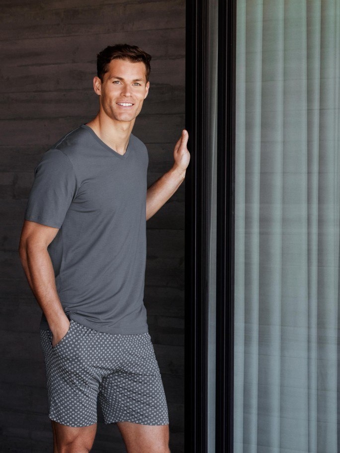 Пижама, состоящая из футболки с короткими рукавами и V-образным вырезом, шорт с микро-мотивом, эластичной резинкой и боковыми карманами.
