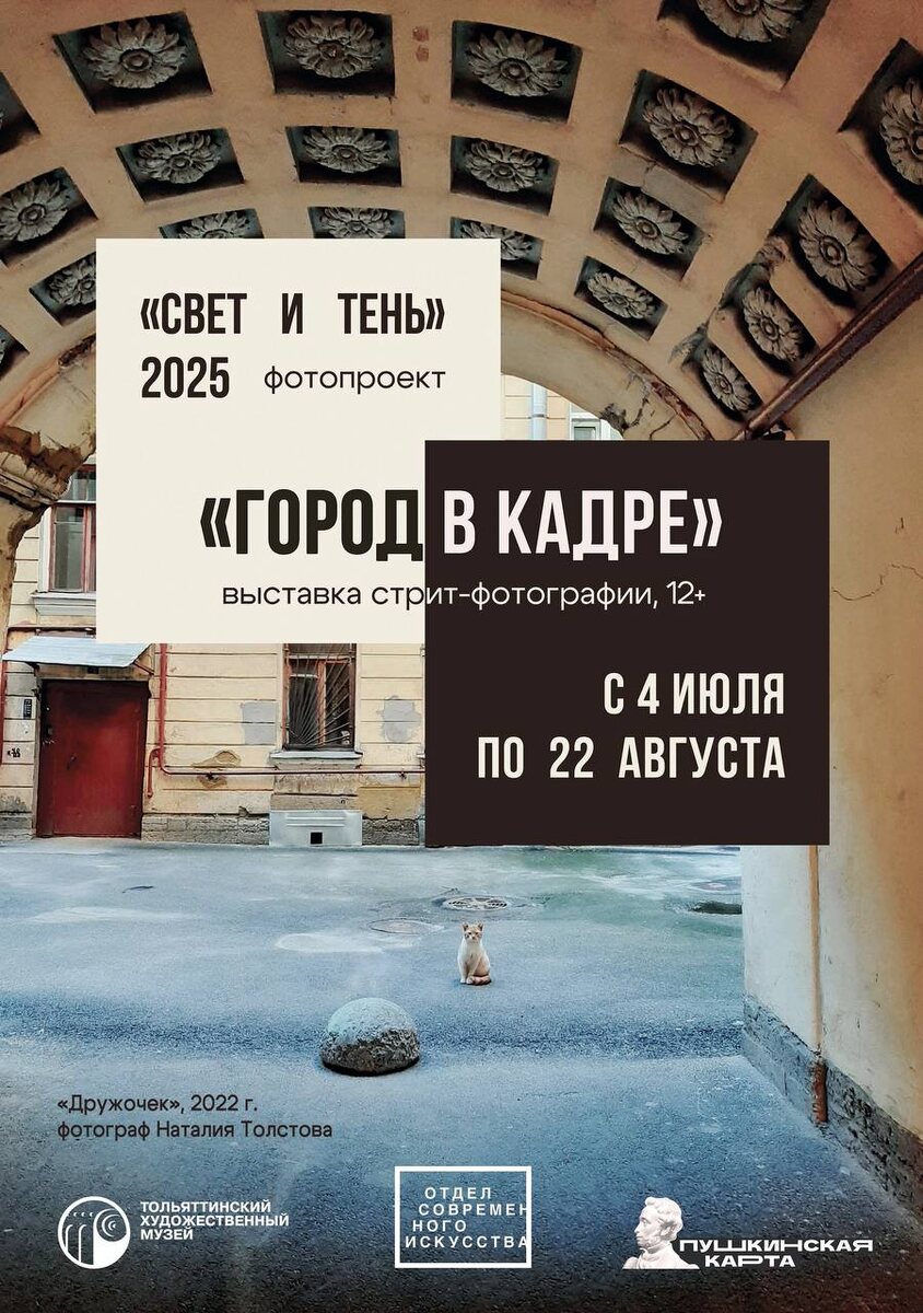 📢 Скоро в Отделе современного искусства Тольяттинского художественного музея открывается выставка «Город в кадре»! Выставка «Город в кадре» будет работать в рамках фотопроекта «Свет и тень», который в Тольяттинском художественном музее проводится ежегодно. В экспозиции будут представлены работы как профессиональных фотохудожников, так и начинающих фотографов – студентов ТГУ различных направлений обучения. Выставка «Город в кадре» будет работать в Тольяттинском художественном музее (Тольятти, ул. Свердлова, 3) с 4 июля по 22 августа 2025 года. Подробнее👈