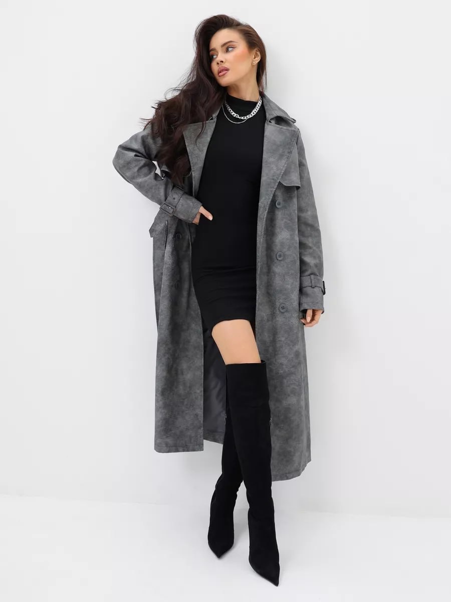 Стильный удлиненный кожаный плащ — идеальный вариант для тех, кто живет в ритме большого города. Лаконичный дизайн и свободная форма — составляющие, которые помогут выбрать любой образ в зависимости от настроения.