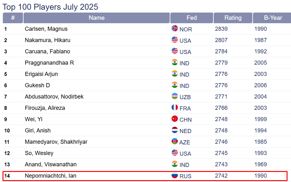 Это его самый низкий рейтинг с 2019 года — и именно его уход из десятки стал причиной исторического момента: в топ-10 ФИДЕ впервые нет россиян.