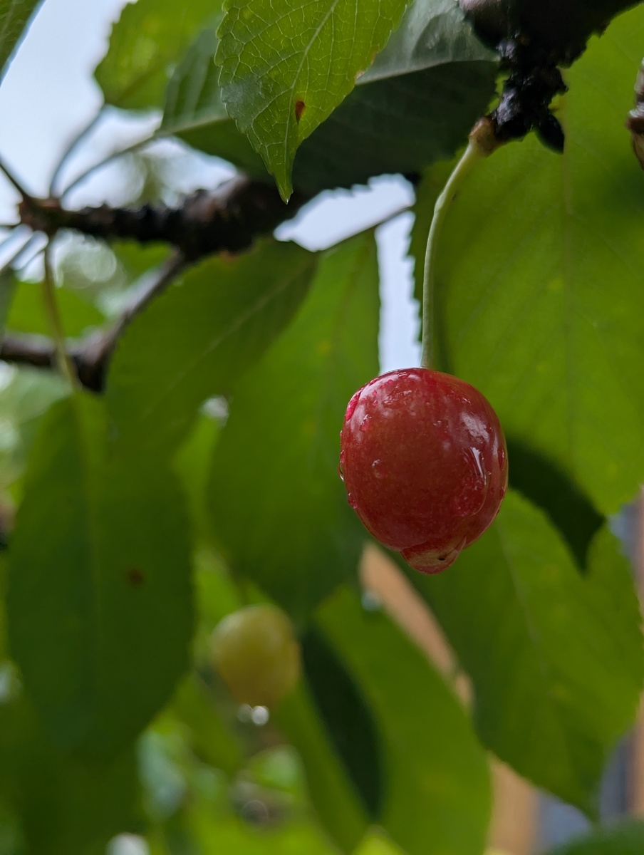 Это лето навевает мне воспоминания из детства. Во взрослой жизни я такого уже не припомню (хотя вроде лето 2017 (или 2016?) тоже было холодным). А в детстве — сидишь, бывало, на Можайском водохранилище, и неделю не можешь из палатки вылезти. Одним рыбакам хорошо. Ведь рыба, как известно, "между жизнью и смертью стоит, оттого она и немая и глядит без выражения; телок ведь и тот думает, а рыба нет — она все уже знает". Рыба тоже не любит жару, и лучше клюет в дождь. Но мне такое лето всё равно нравится больше, чем жаркое и засушливое. Хотя с дождями в этот раз всё же немного перебор. А сад вроде выглядит довольным. Много в этом году черешни. Но и птиц много. Налетают целыми стаями, объедают ещё не успевшие созреть ягоды. Уже ясно, что нам ничего не достанется. Я тоже попробовала недозревшие ягоды - и на удивление, они вкусные. Со спелыми, конечно, не сравнить, но и эти вполне ничего: Это сорт Ревна, спелые ягоды должны быть бордовыми. Был один год, когда ягод было так же много (если не б