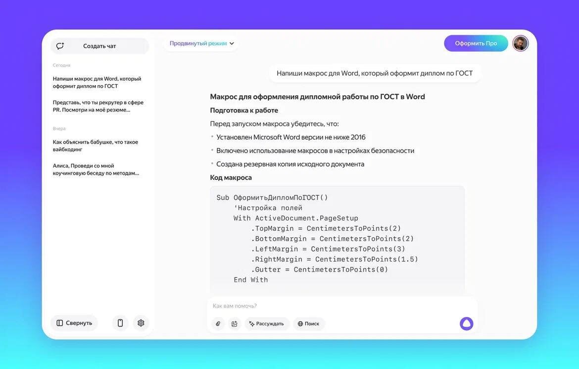 Без подписки «Про» в чате с «Алисой» пользователи теперь могут бесплатно решать учебные, рабочие и личные задачи: генерировать тексты, находить ответы, создавать изображения, работать с файлами и включать режим рассуждений.