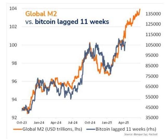 Я думаю, все уже давно убедились в том, что биткойн- это никакой не инструмент для хеджирования во времена турбулентности, а, наоборот, отражение глобального риск-аппетита и ликвидности. С риск-аппетитом сейчас все в порядке, иначе, широкие индексы рынка акций не торговались бы на своих исторических максимумах. Если посмотреть на динамику ликвидности (агрегат М2 в трлн.$), то обращает на себя внимание высокая позитивная корреляция между ее значением и динамикой биткойна с задержкой примерно 2,5 месяца. Поэтому, при прочих равных, есть основания предполагать, что биткойн может присоединиться к остальным рисковым активам и получить новый импульс к росту в ближайшие несколько недель. А хорошим поводом для этого мог бы стать пробой исторического максимума 112к и выход из консолидации, которая продолжается с момента его достижения 22 мая.