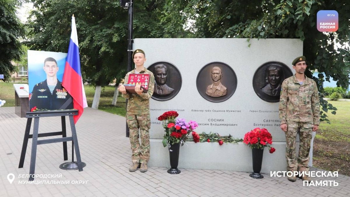 В Белгородском муниципальном округе в поселке Октябрьский на Аллее Памяти партийцы открыли барельеф ефрейтору Максиму Соснину. Максим погиб в возрасте 21 года при исполнении служебных обязанностей в зоне Специальной военной операции. За проявленные самоотверженность и отвагу во время службы Максим награжден тремя Орденами Мужества.