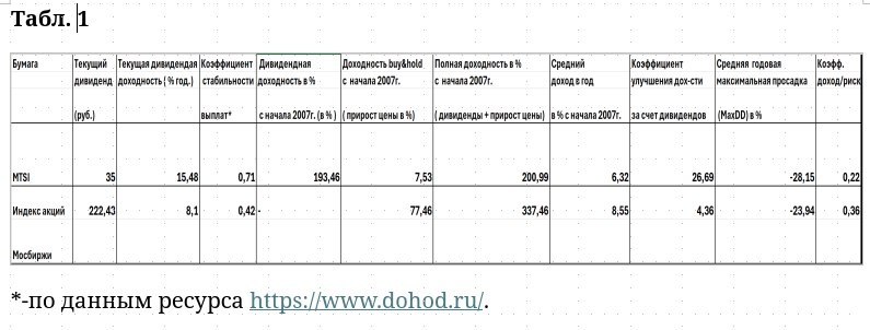 Дивидендные акции МТС, насколько они «дивидендные»? Часть 2 Часть 1 Рассмотрим, насколько соответствуют акции МТС этим критериям. Взглянем на табл. 1. В этой таблице приведены несколько показателей доходности и не только, по акциям МТС, в сравнении с широко известным индексом акций Мосбиржи. Например, приведены показатели текущей дивидендной доходности, то есть отношение текущей рыночной цены к величине предстоящего дивиденда. Вся статистика приведена с начала 2007 г. Почему с 2007 года, ведь дивидендная история МТС известна с 2004 г.? Все дело в том, что подобную статистику есть смысл сравнивать не только с индексом, но и с другими акциями, что и будет сделано в дальнейшем. А на нашем рынке у каждой акции своя дивидендная история со своей длиной. И чтобы охватить наиболее широкую выборку по большому количеству эмитентов, приходиться брать интервал с 2007 года. Как мы видим, текущая дивидендная доходность у МТС весьма неплоха - более 15%, и она превышает, что называется, среднюю «