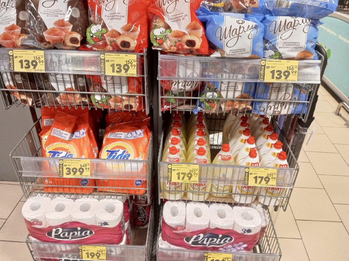 Уже которую неделю подряд совершенно не нравится подборка около кассы, раньше там и бакалея была, и консервы, и другие хорошие продукты, а теперь стабильно половина заполнена кондитерскими изделиями (причем не самыми популярными), а половина бумагой и средством для стирки. Меняется только что-то третье, на этой неделе добавили гель для посуды "Fairy", популярный, не особо затратный, по акции большой флакон стоит 179 рублей.