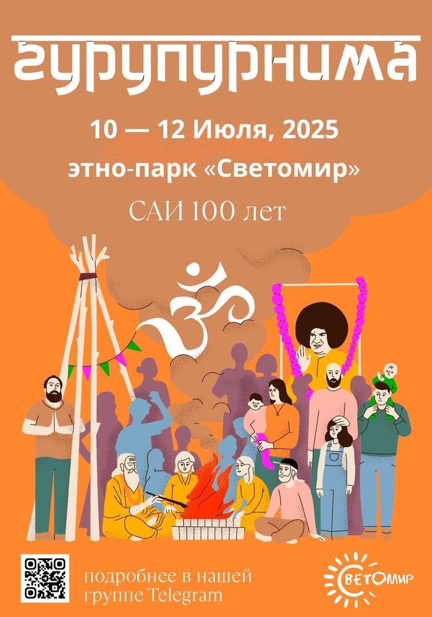 ЭТНО-ПАРК «СВЕТОМИР» приглашает 10-13 июля на Фестиваль индийской культуры «ГУРУПУРНИМА-2025», посвященный 100-летию прихода аватара Шри Сатья Саи Бабы. В программе: 🪷 Бхагаван Шри Сатья Саи Баба - Видео-лекция на Гурупурнима, сатсанг о Единстве по теме лекции. 🪷 Доктор Гьянешвар и брамины - Гаятри Ягья, лекция о ведическом наследии, ашрам Шантикундж, Харидвар, Индия. 🪷 Аджай - Гуру Хома, лекция, ашрам «Тапован», Крым. 🪷 Никита Берсенев - лекция официального представителя ашрама Шри Сатья Саи Бабы, Путтапарти. 🪷 Владимир Муранов – духовный практик и музыкант, лекция-концерт. 🪷 Влад Лукин – концерт группы LOOKIN. t.me/SaiSvetomir